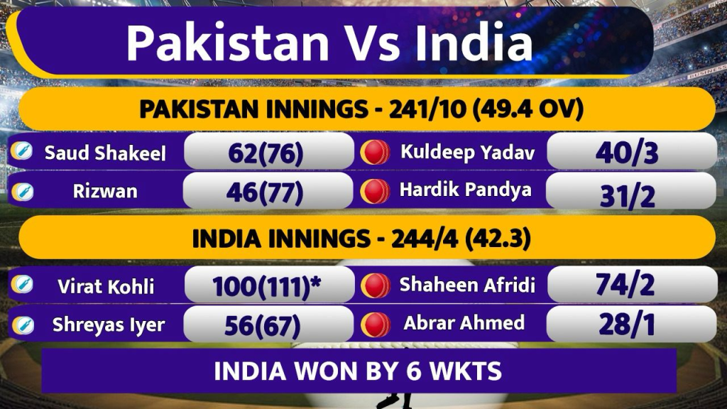 चैंपियंस ट्रॉफी के ग्रुप-ए मैच में पाकिस्तान से भारत को जीत के लिए 242 रनों का लक्ष्य मिला था जिसे भारतीय टीम ने 43वें ओवर में ही 4 विकेट खोकर हासिल कर लिया था. भारत के लिए मैच में विराट कोहली ने अपने वन-डे करियर का 51वां और इंटरनेशनल करियर का 82वां शतक बनाया. इसी ऐतिहासिक पारी के बाद विराट को ‘प्लेयर ऑफ द मैच’ का भी अवॉर्ड दिया गया था.