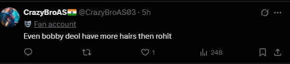 भारतीय पूर्व कप्तान रोहित शर्मा ने हाल ही टेस्ट क्रिकेट से संन्यास लिया था और वे फिलहाल लंदन में छुट्टियां मना रहे हैं, जहां उनकी मुलाकाल बॉबी देओल से हुई. उन्होंने एक सेल्फी लेकर इस पल को यादगार बनाया, लेकिन कुछ फैंस ने इस तस्वीर को देखकर रोहित की फिटनेस पर क्लास लगा दी. दरअसल, 38 साल के रोहित की फिटनेस हमेशा से एक चिंता का विषय रही है और उन्हें अक्सर मोटापे को लेकर आलोचना झेलनी पड़ी है.